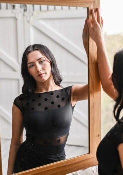 Perfect for practice and performance, the Seraphina Leotard is a must-have. Matt nylon fabric creates a flattering silhouette, has high coverage and is super comfy. With cap sleeves and a low scoop back, the Seraphina will truly compliment your performance and accentuate your lines. Our favourite feature is the polka dot mesh detailing along the neckline and across the mid section. A fabulous look for ballet or jazz.