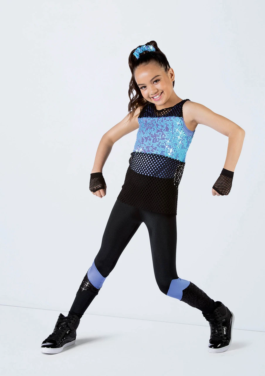 -Shiny spandex unitard with neon and sequin spandex insets at the calves