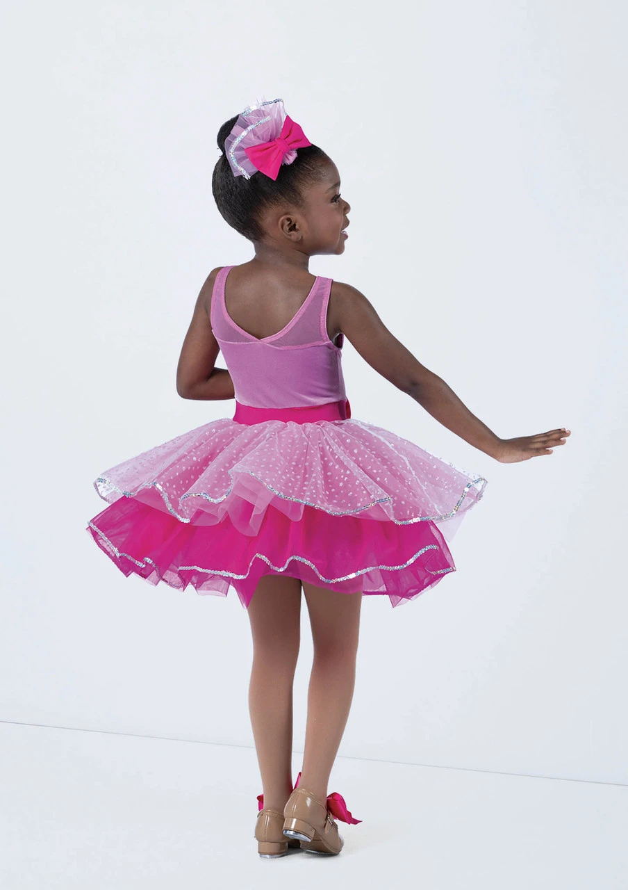 -Glitter dot tulle top skirt and layered tricot underskirt have sequin trim