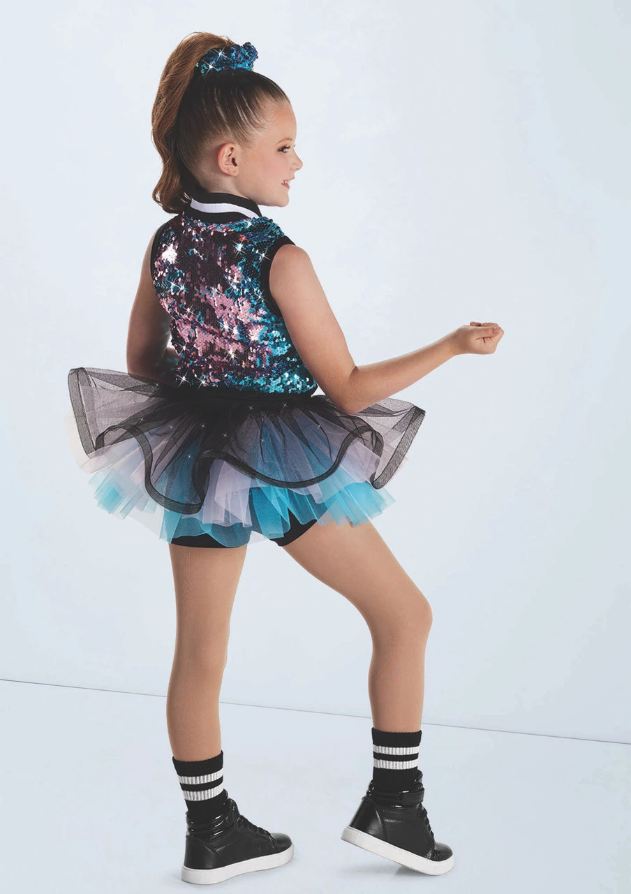Vest is Two-Way Ultra Sparkle with rib knit collar